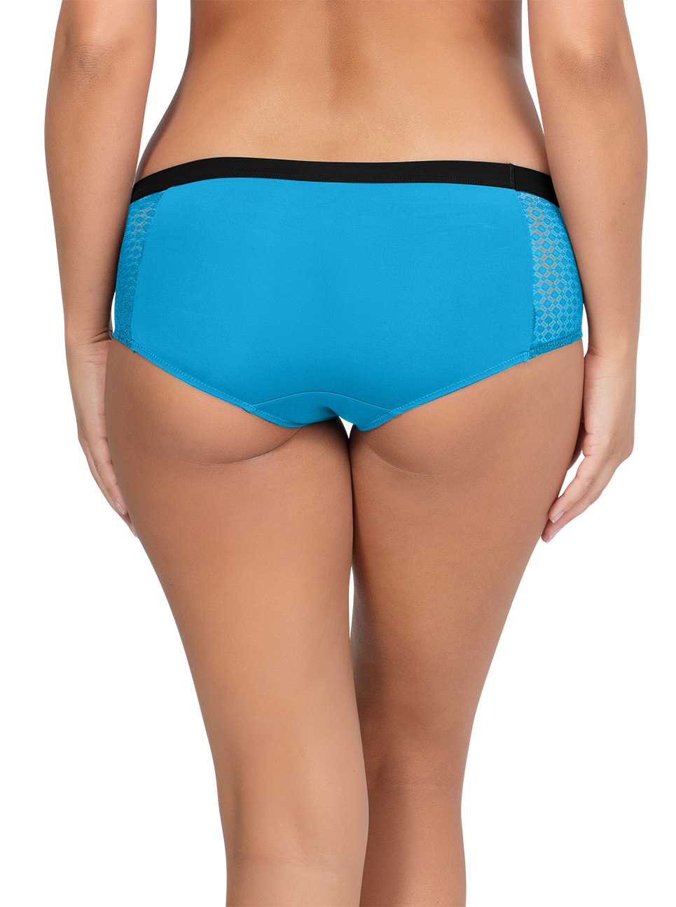Sporty styling complements the mid-rise fit with moderate coverage. Diamond pattern mesh side panels combine with smooth microfiber for extra appeal.